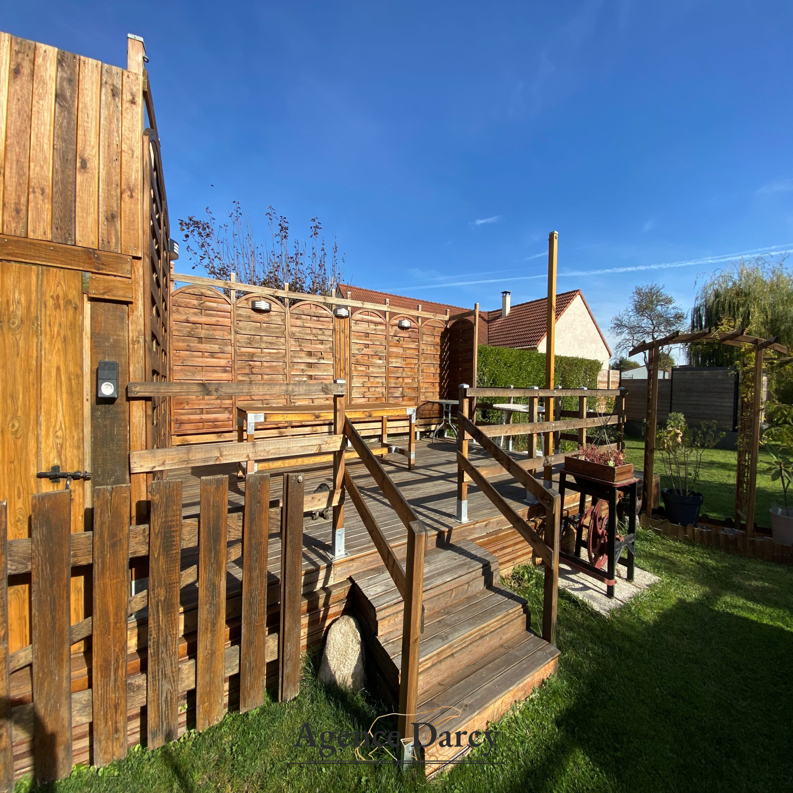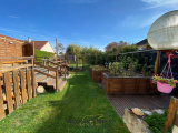 Un jardin arboré avec une grande terrasse en bois, une cave, un garage, et un atelier, le tout sur une parcelle 587m².