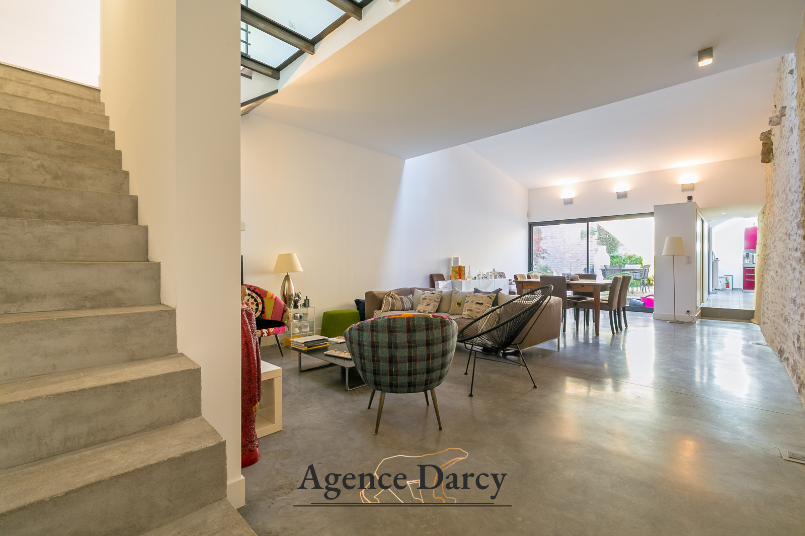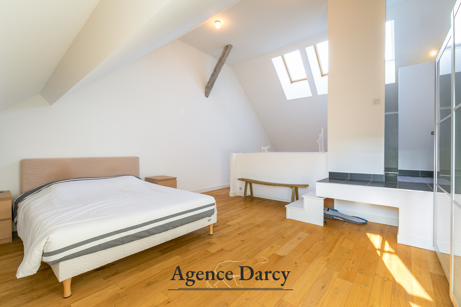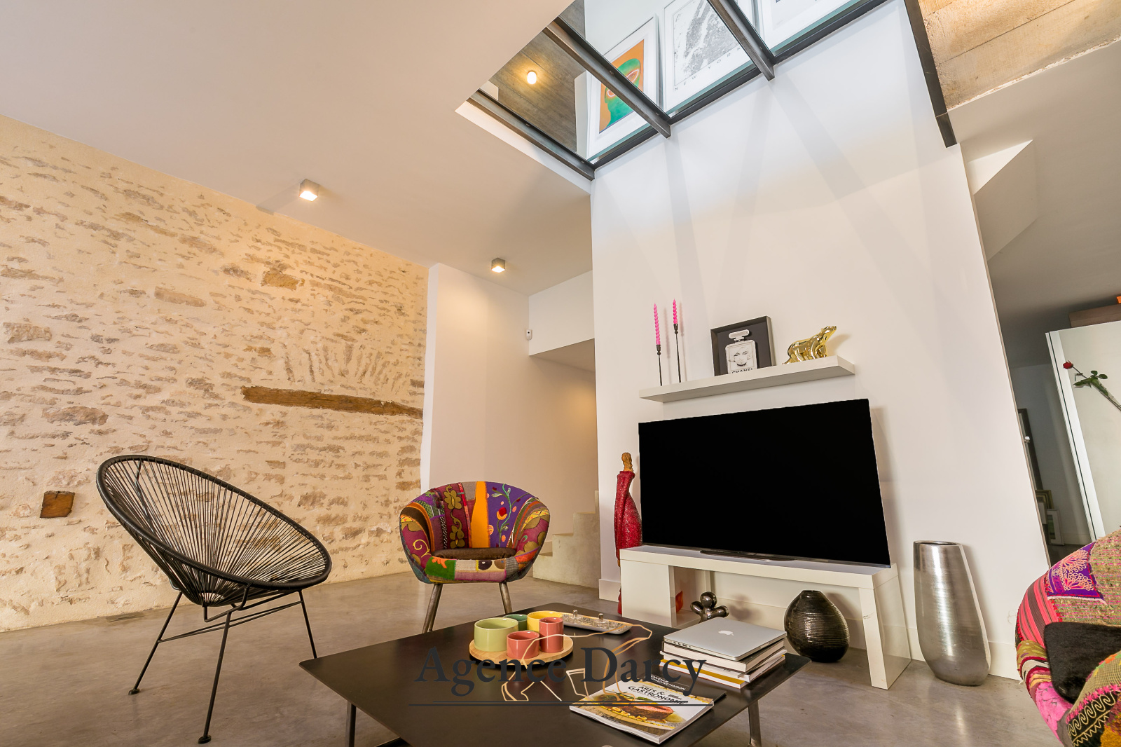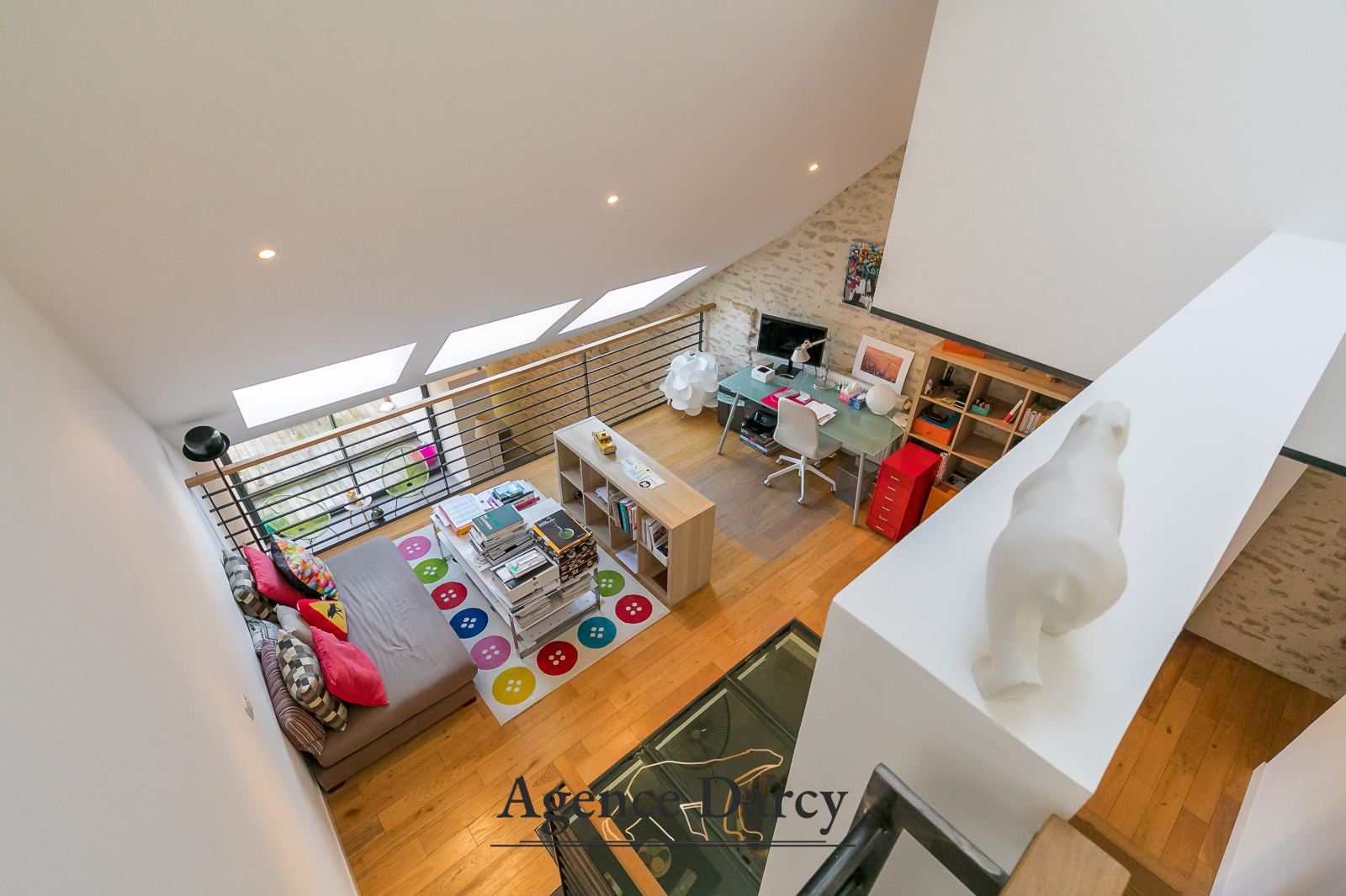 Salon-séjour cathédrale sur terrasse, cuisine équipée, 3 chambres sur 2 niveaux dont une suite parentale avec salle d'eau privative, bureau, salle de bain.