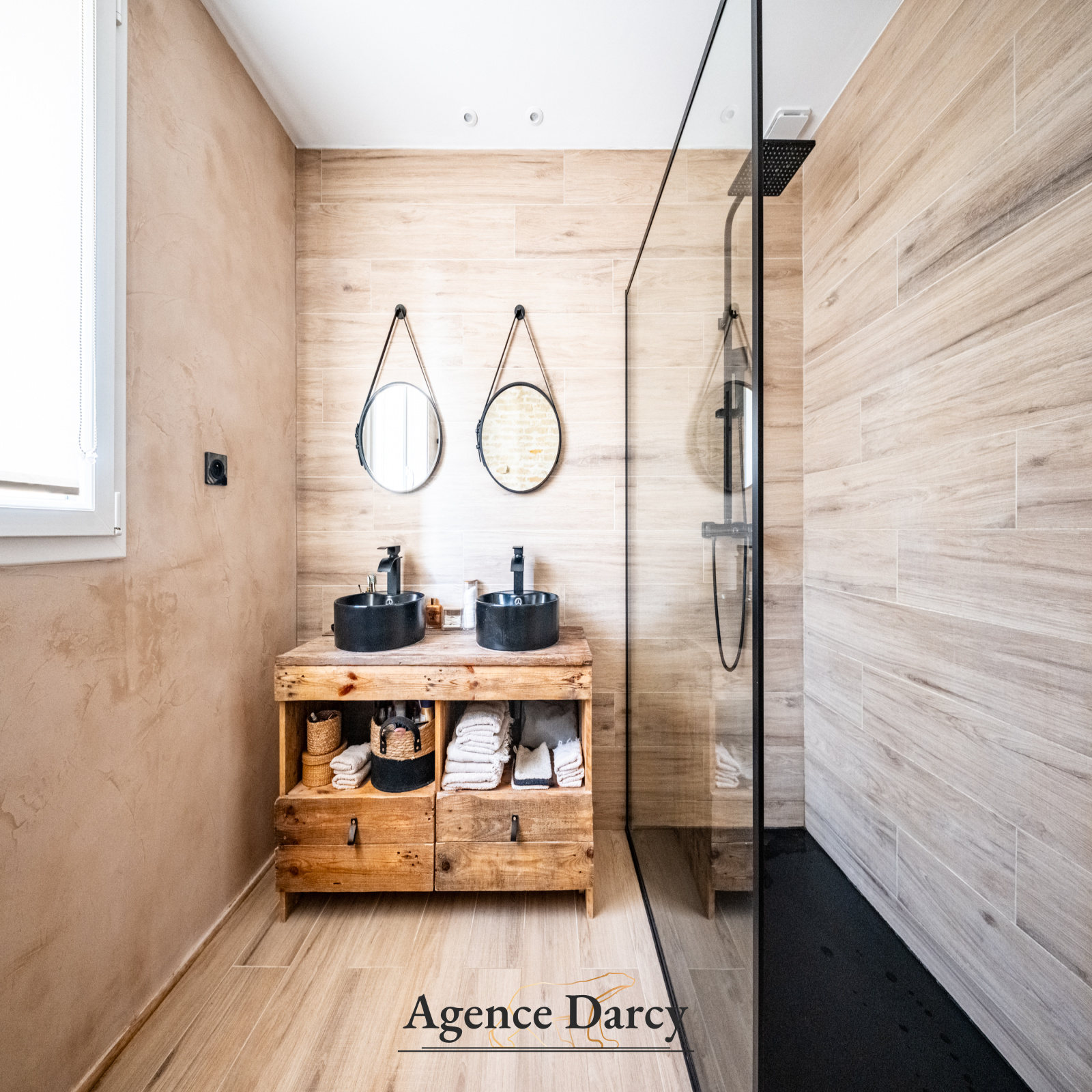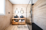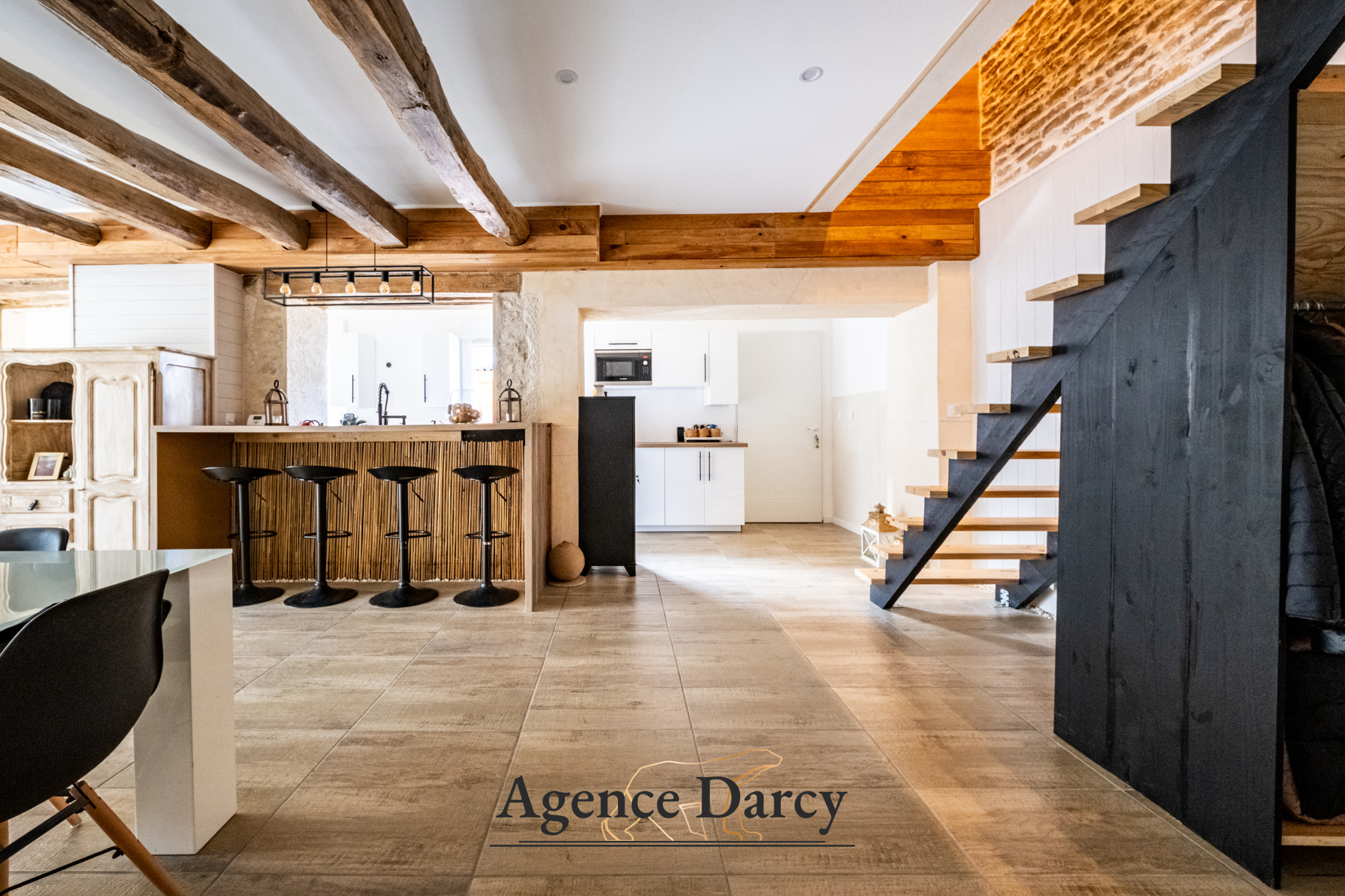 Dès l’entrée, les volumes et la luminosité donnent le ton. La maison développe environ 210 m² habitables (et près de 250 m² avec les mezzanines), dans une atmosphère chaleureuse mêlant pierre, bois et modernité.