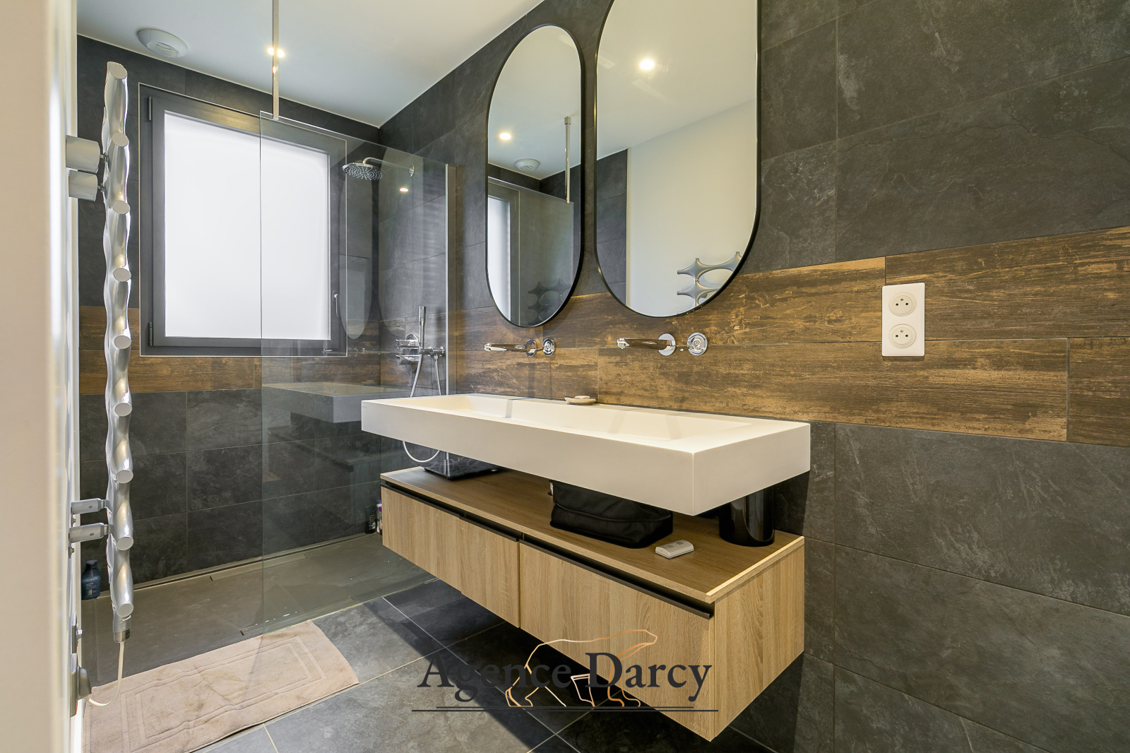 Au rez-de-chaussée, une cuisine haute gamme ouverte et totalement équipée, une suite parentale avec salle d'eau, un bureau, un cellier et une buanderie.